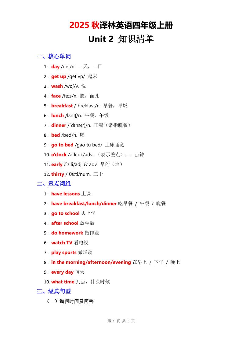 2025秋译林英语四上Unit1知识清单