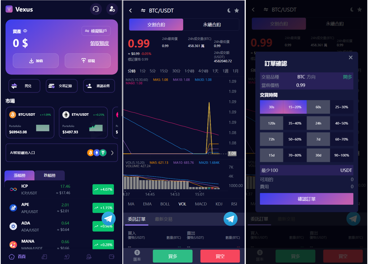 Vexus多语言虚拟货币交易所/java交易所源码/模拟账户+现货交易+永续合约+交割合约+基金理财+锁仓挖矿+质押贷款+闪兑